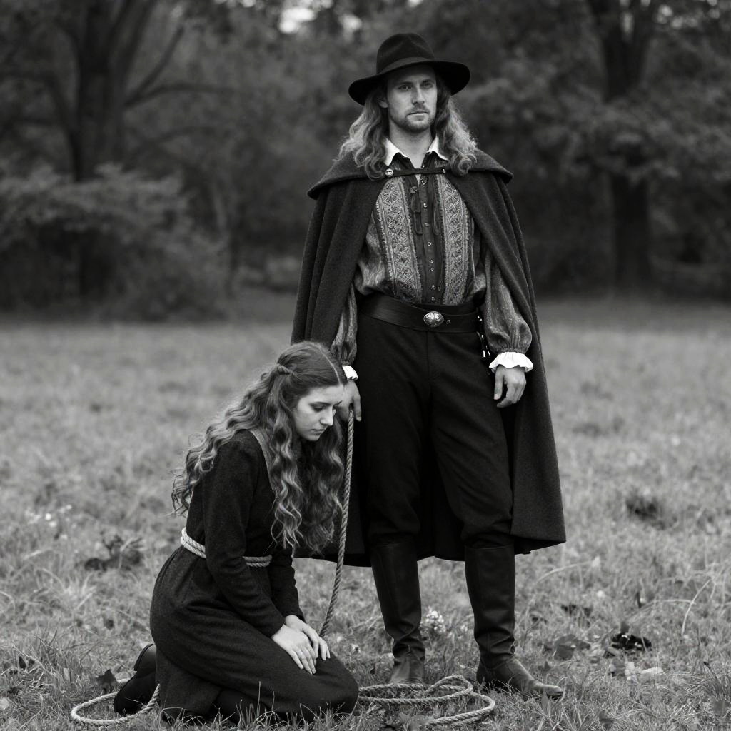 Black and white photograph featuring two men with long hair standing outdoors with trees in the background. The man on the left wears a dark wide-brimmed hat, light button-up shirt, and dark buttoned vest while holding a white cloth. The man on the right has a beard, long hair, a dark shirt, and a rope draped around his chest. Both men display intense expressions and are looking in different directions.
