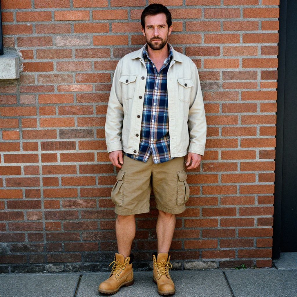 A man, earth-toned plaid shirt, relaxed-fit cargo shorts, rugged tan work boots, lightweight canvas field jacket, rustic brick exterior, technicolor analog film stock, confident expression Man has masculine face and piercing eyes