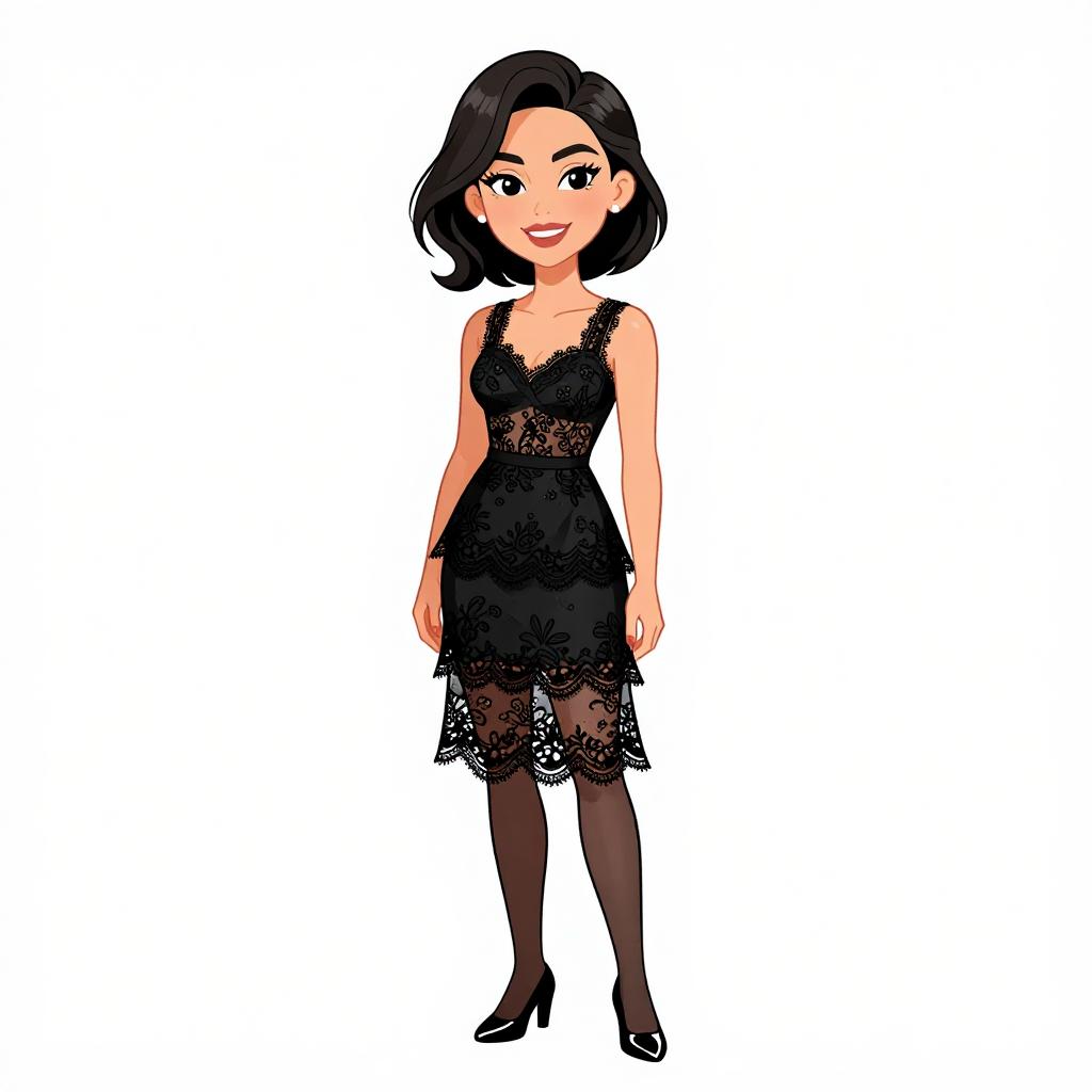 Illustration of a smiling woman with short black hair wearing a sleeveless black tiered dress with intricate lace and eyelet detailing. The dress features a scoop neckline, scalloped lace hem above the knee, and a sheer lace upper section with a solid black underlayer. She is wearing opaque black tights and black patent leather oxford shoes, standing against a white studio background.