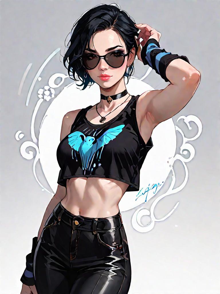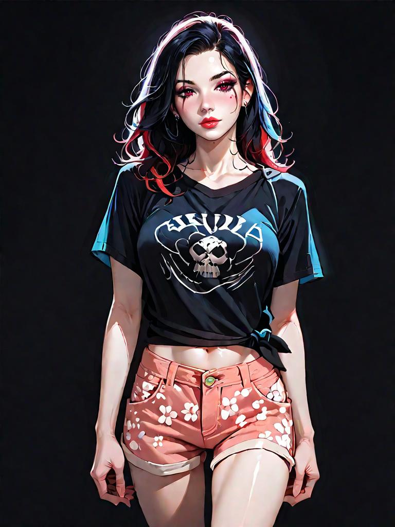 Digital illustration of a stylish woman with short black hair and pale skin, wearing a white cropped t-shirt with a graphic print, a shiny black leather mini skirt, long black sleeves, and chunky black platform ankle boots with gold accents. She accessorizes with large gold hoop earrings, layered necklaces, and a black choker. The background is a minimalistic studio setting with soft shadows.