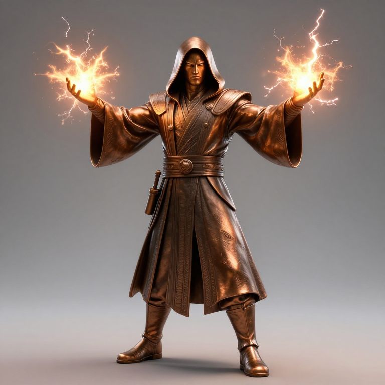 Bronze studio lit character, standing with arms outstretched to demonstrate power, glowing, explosion, hooded, powerful Jedi type character, lightning, full body, hyper realistic, 8k,