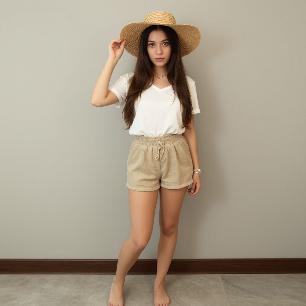 "wood nymph costume, 1girl, solo, hat, jewelry, long hair, bracelet, necklace, brown hair, standing, straw hat, skirt, shirt, full body, looking at viewer Realistic photo of casual sexy person with pretty face"