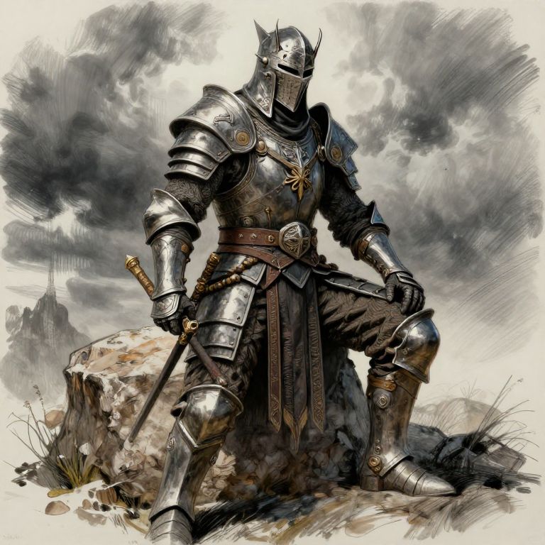 Digital painting of a knight in full medieval armor, seated on a rock, holding a sword, under a stormy sky.