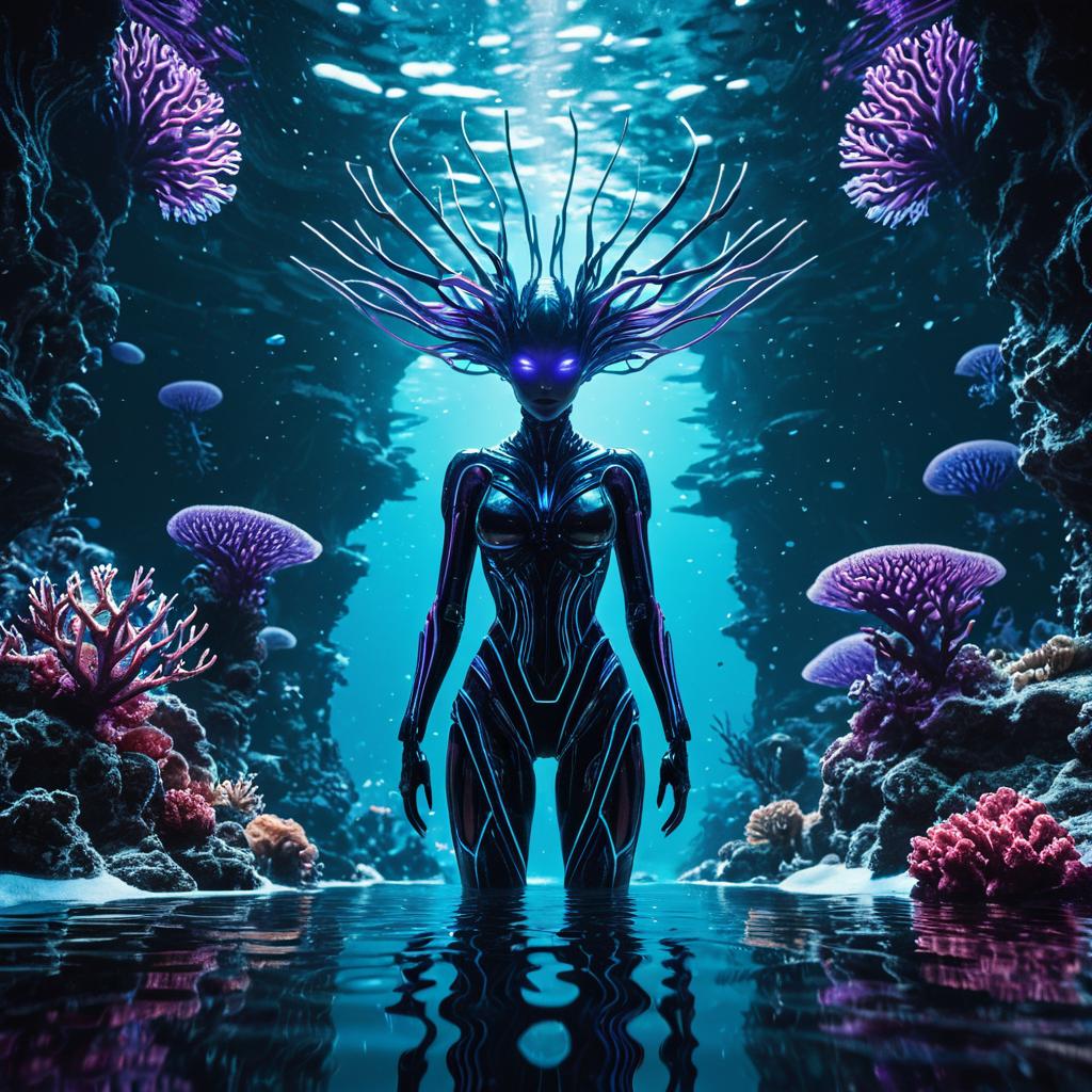 An ultra detailed and high technology alien landscape, featuring alien corals, a futuristic artificial intelligence superstar with frames made of elaborate glowing circuits, deep blue and violet cold tones color theme, soft rim lighting with shafts of light penetrating water, centered with symmetrical plume geometries elevated above coral formations composition, plume of intricate geometry, viscous water texture with rippling wave distortions, highly detailed digital painting, sharp focus in the style of Luminokaya, mystical colors, rim light, octane render, 8k, raytracing, underwater visual distortion and glowing quantum particles, dark tones, trending on artstation