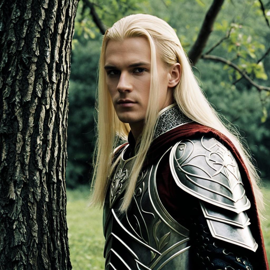 Prince nuada,1boy, male focus, solo, blonde hair, long hair, tree, realistic, outdoors, looking at viewer, armor