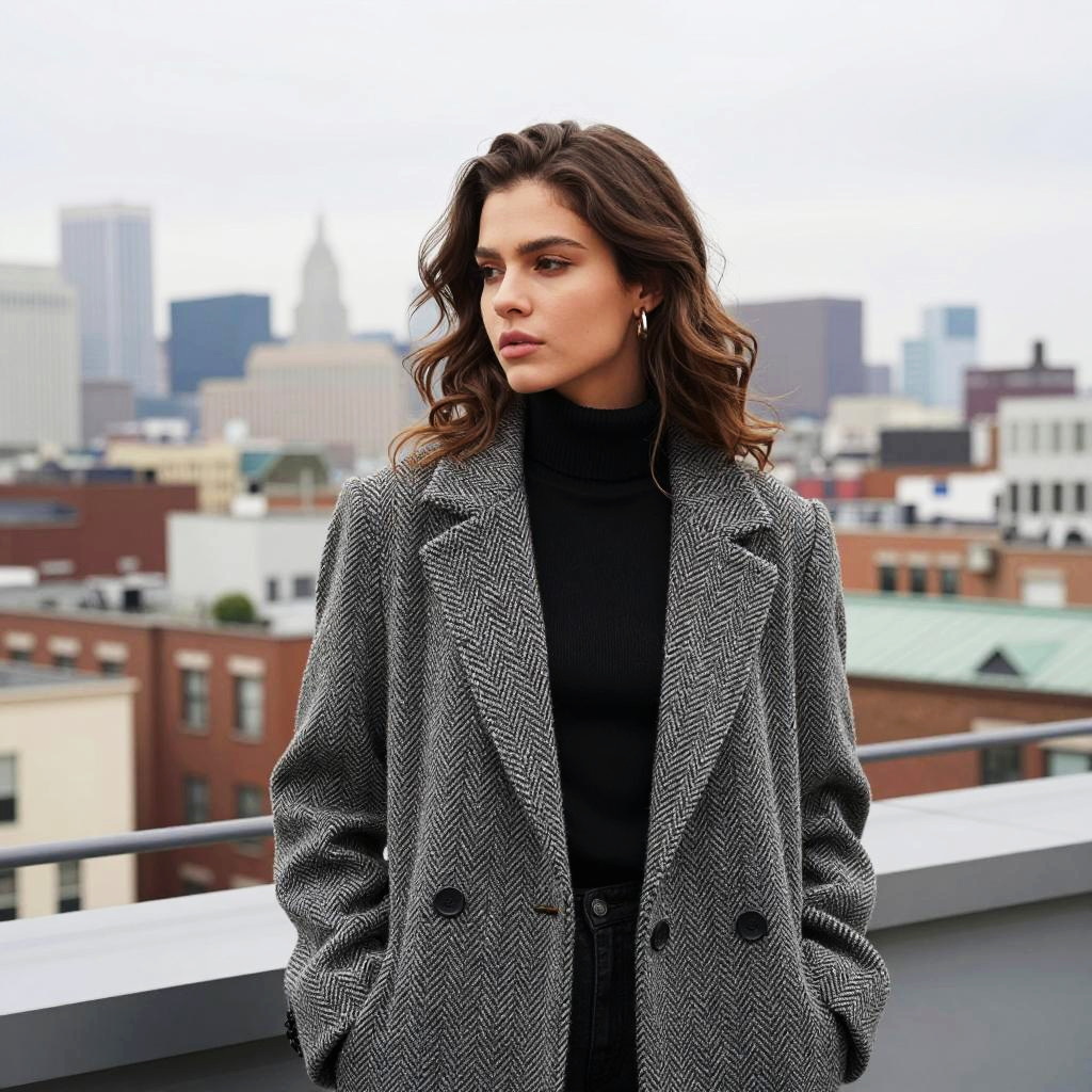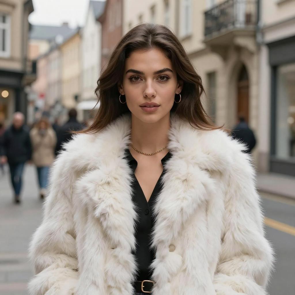 Photograph of a woman with long, wavy brown hair, wearing a thick, white fur coat. She stands slightly turned to the side, gazing directly at the camera with a serious expression. Blurred cityscape background. Soft, natural light.