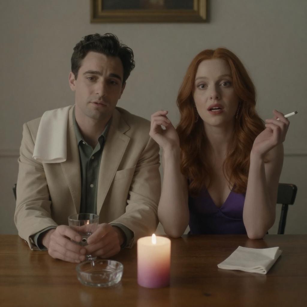 Photograph of a man and woman sitting at a wooden table in a dimly lit room. Man with short dark hair, beige blazer, green shirt, holding a glass, white cloth draped over his chair. Woman with long red hair, purple dress, cleavage, holding a cigarette, surprised expression. Candle with white and pink gradient, glass ashtray, and a folded napkin on table.