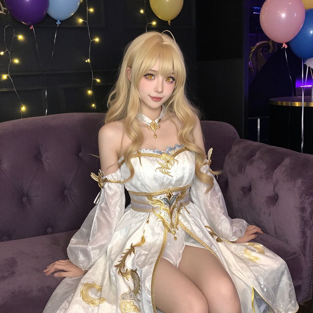 A digital CGI image of a blonde woman with long, wavy hair, sitting on a purple velvet couch. She wears an off-the-shoulder, white, ornate dress with gold trim, revealing her thighs. The dress has long, sheer sleeves and a high collar. Her skin is fair, and she has a soft smile. The background features black walls adorned with string lights and colorful balloons in yellow, pink, and blue. The setting has a festive, elegant atmosphere.