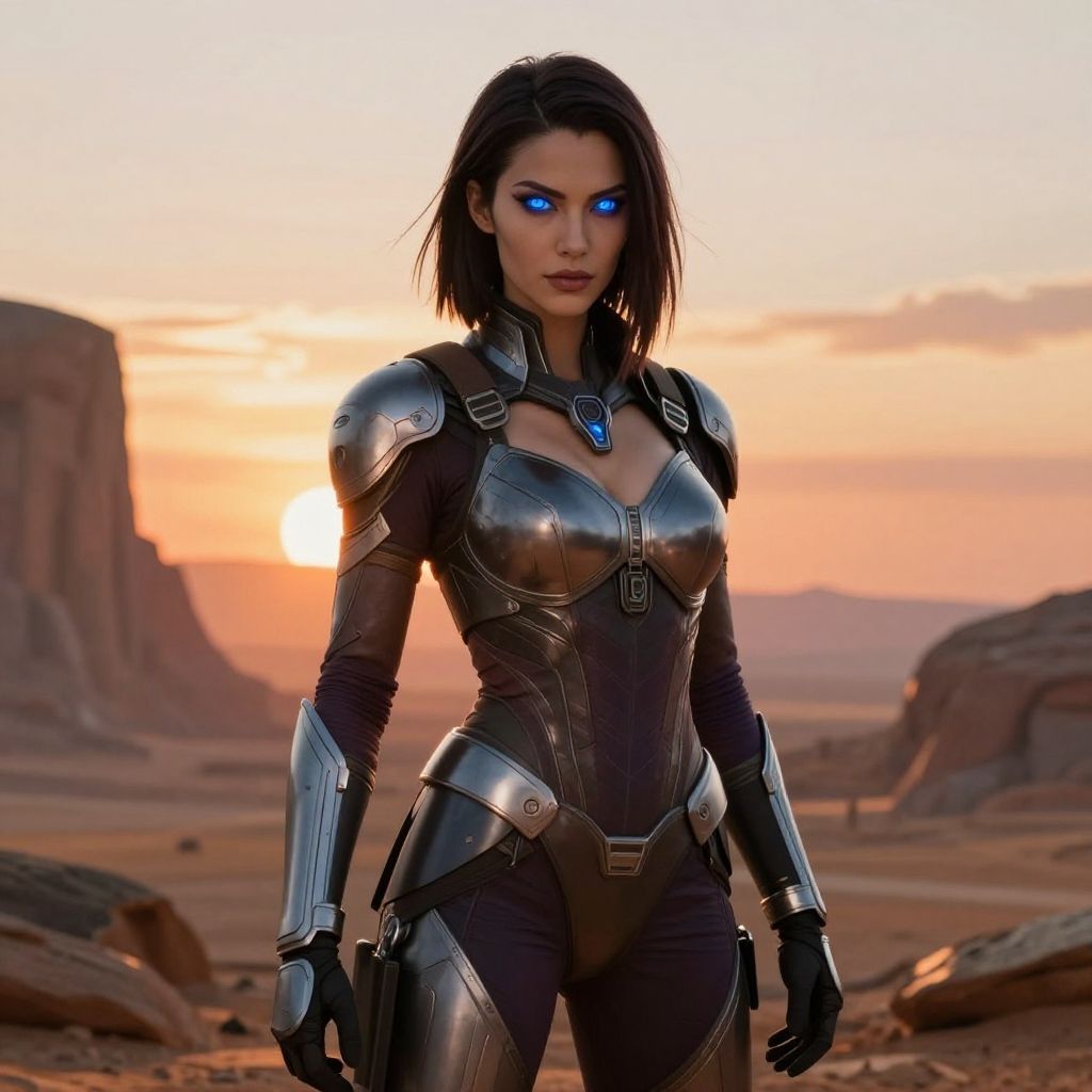 Sexy Bo Katan with glowing blue eyes, sleek battle armor, standing on a rugged alien planet, dramatic sunset, intense expression, high detail and sharp focus, cinematic sci-fi illustration