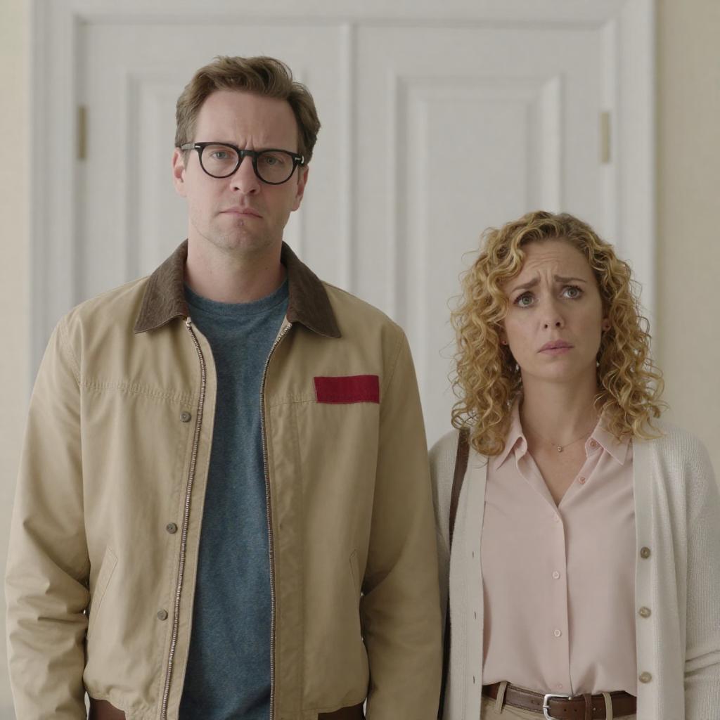 Photograph of two people standing in a cornfield. Man with brown hair, beard, dark jacket, blue shirt, looking ahead. Woman with red bob haircut, black jacket, dark top, hand on man's arm, looking slightly to the right. Blue sky background. Both have neutral expressions.