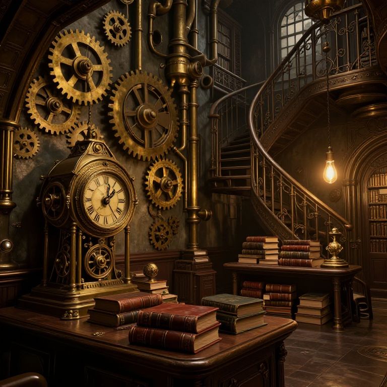 Steampunk library: Dark, richly detailed room with large clock, brass gears, spiral staircase, illuminated books, and warm, vintage lighting.