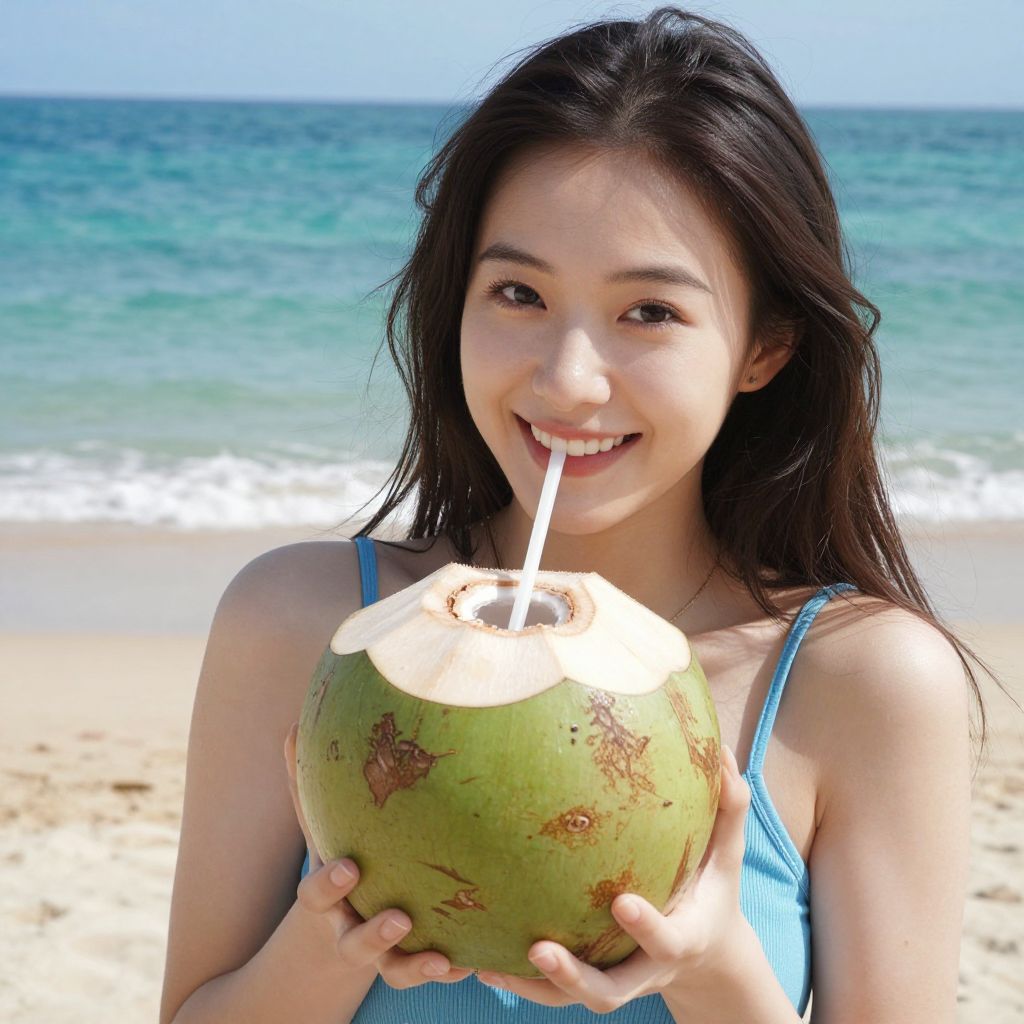 Photograph of an Asian woman with long, dark hair and a light skin tone, smiling while holding a green, coconut with a white straw in her right hand, sipping from it. She wears a blue and white striped, sleeveless top. The background shows a clear, blue sky and a turquoise ocean with gentle waves on a sandy beach. The coconut has brown spots and is cut open at the top. The image is brightly lit, capturing a sunny, tropical beach setting.