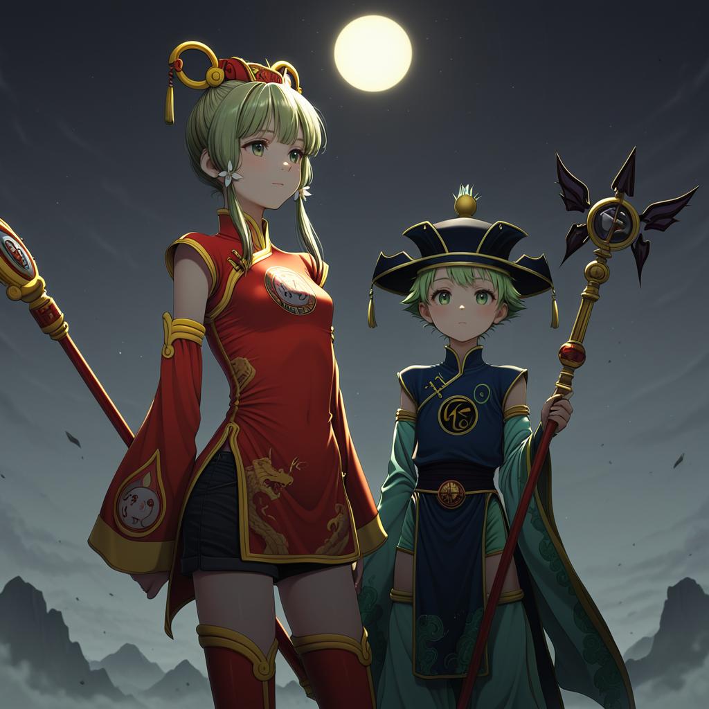Digital anime-style artwork featuring two characters with green eyes and green hair dressed in traditional Chinese-inspired costumes. The taller character wears a red dress with dragon embroidery, thigh-high boots, and detached sleeves, while the shorter character is dressed in blue and green with a distinctive hat and a decorative staff. Both hold staffs and stand under a full moon with silhouetted mountains in the background.
