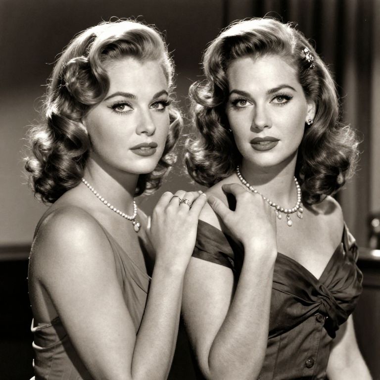 Photograph of two fair-skinned women with short, dark brown, wavy hair, styled in vintage 1940s fashion. Both wear elegant, sleeveless dresses; the woman on the left in a light blue satin dress, and the woman on the right in a pink satin dress. Each has a classic pearl necklace and red lipstick. They sit close together, the woman on the right touching her shoulder with her right hand. The background is a softly lit, neutral-colored room with a partially visible white door and wooden paneling on the left. The image has a retro, timeless feel.