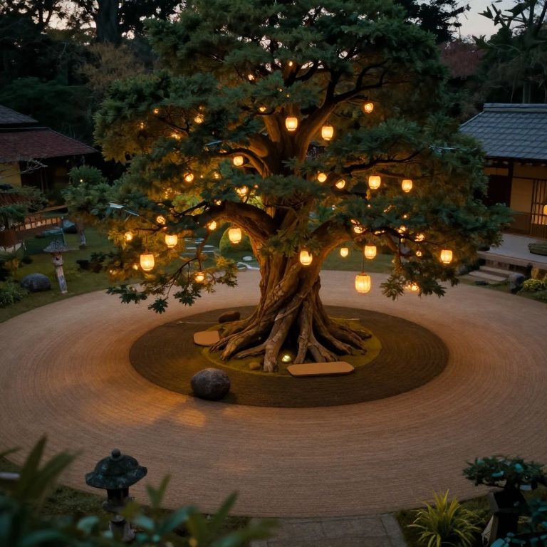 Photograph of a serene garden at dusk, featuring a large, twisting tree with numerous warm, glowing lanterns hanging from its branches. The tree is centered on a circular, brick-paved area with a small, round, dark stone pedestal in the foreground. Surrounding the tree are traditional Japanese wooden structures with tiled roofs. The background includes dark green foliage, adding to the tranquil ambiance. The image has a soft, warm light, highlighting the tree and lanterns against the darkening sky. The overall atmosphere is peaceful and inviting.
