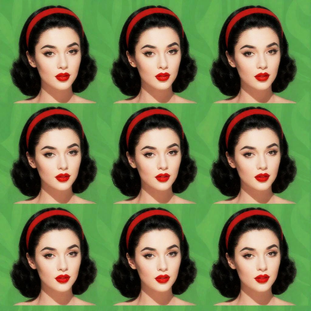 This is a digital pop art-style image featuring nine identical female faces arranged in a 3x3 grid. Each woman has black, slicked-back hair with a red headband, white skin, and bold red lips. The background is a vibrant green with repeating, stylized leaf patterns. The faces have a classic, vintage look, reminiscent of 1950s pin-up art. The image has a strong, retro vibe.