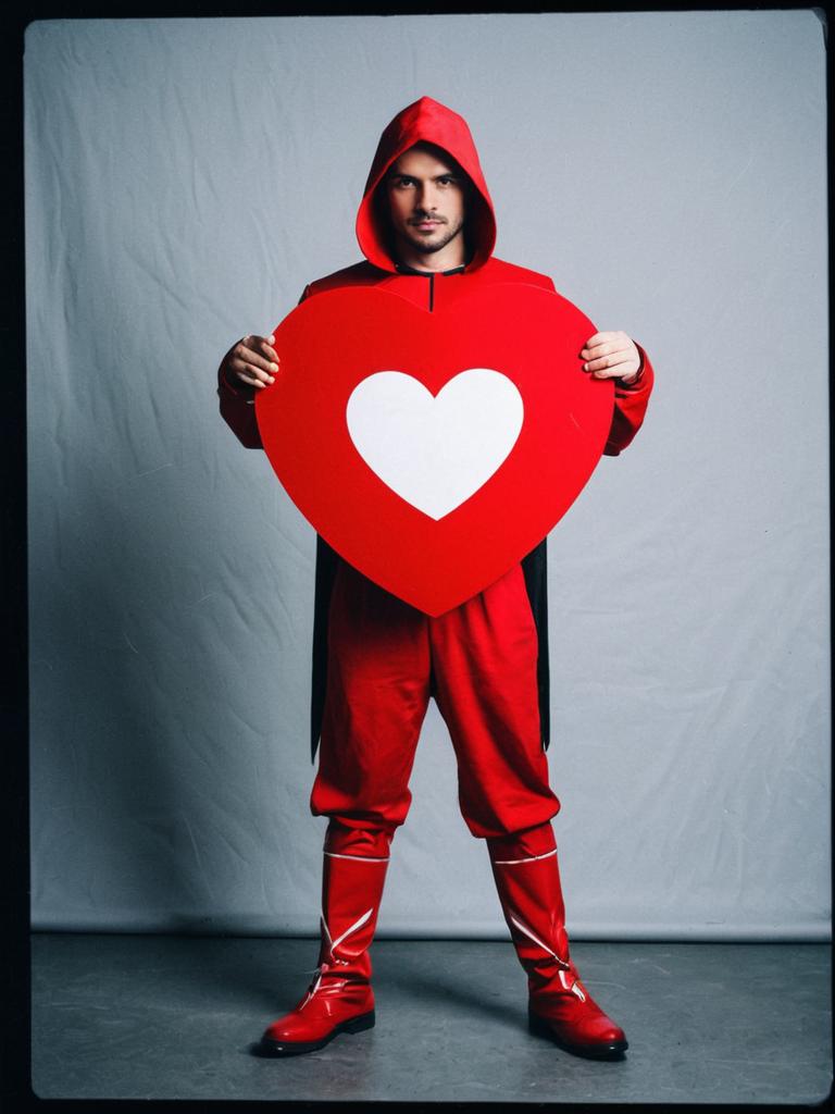 Man in Heart Shaped Love Symbol costume, photorealistic cosplay studio photo