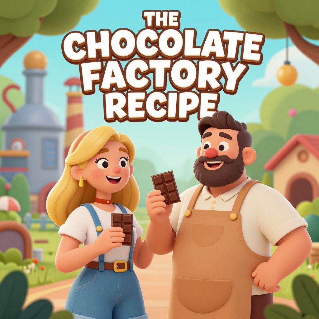 A vibrant cartoon-style illustration featuring two animated characters—a blonde woman holding a chocolate bar and a bearded man in an apron—set against a whimsical backdrop of a factory and lush greenery, with bold text reading \"THE CHOCOLATE FACTORY RECIPE\" in a playful, high-definition digital art style.