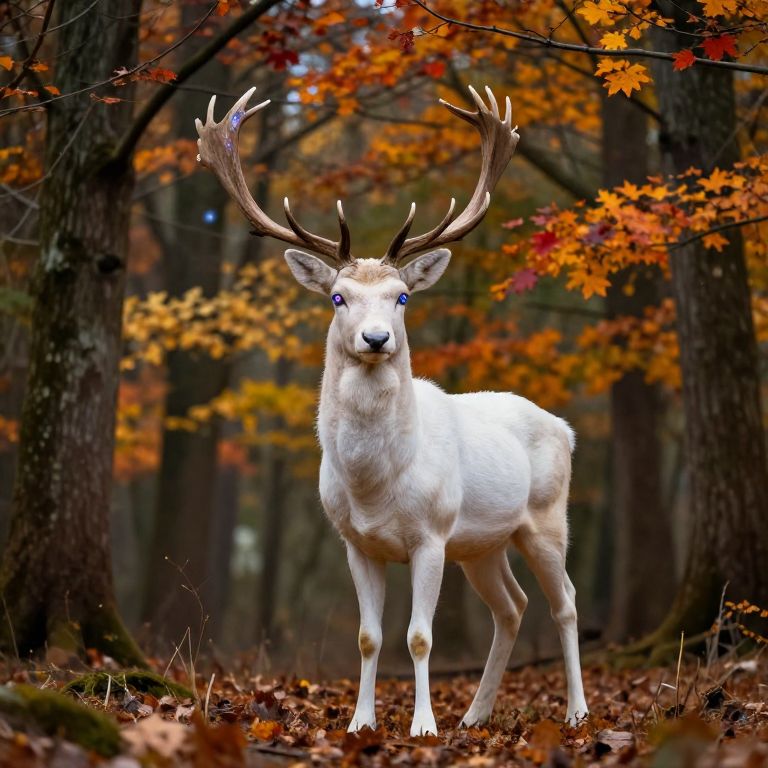 A majestic white stag stands in the center of a dense autumnal forest, its iridescent antlers reflecting the vibrant hues of the season's changing leaves. In the style reminiscent of surrealist masterpieces, this haunting image captures an ethereal moment as the stag's eyes slowly open, revealing galaxies swirling within their depths. The scene is depicted from a low-angle perspective beneath the creature's hooves, evoking a sense of awe and wonder at the otherworldly beauty of nature intertwined with the mysteries of the cosmos.