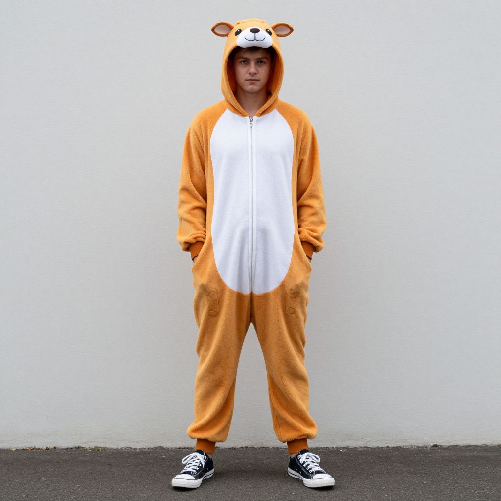 Onesie costume australia, solo, 1boy, male focus, shoes, sneakers, full body, realistic, hood, hands in pockets, animal costume, standing, looking at viewer, cosplay