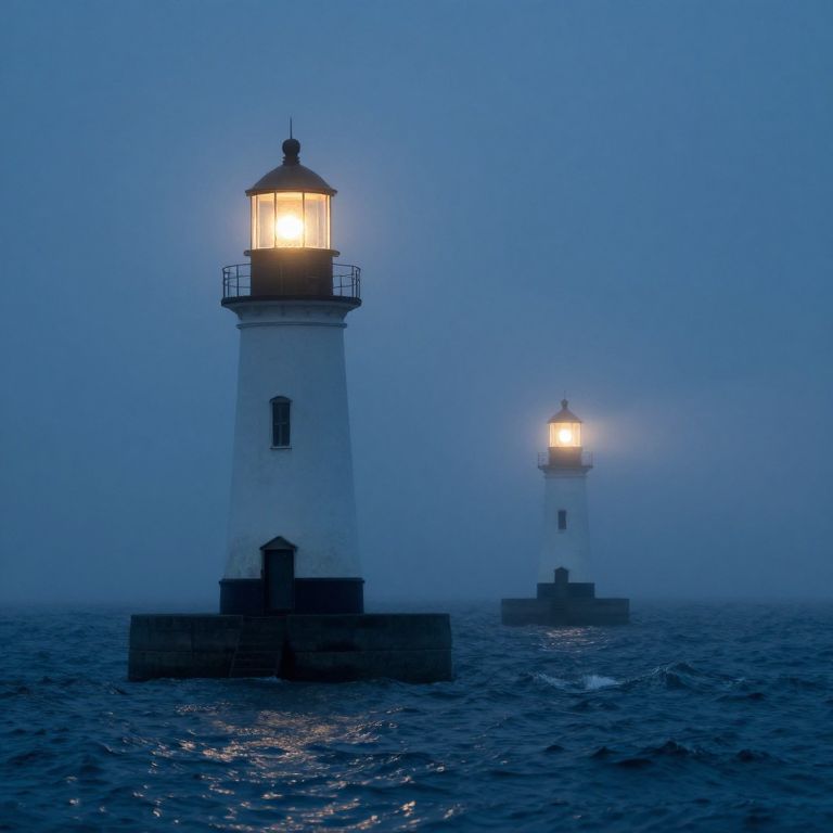 Photograph of two glowing lighthouses standing in a misty, dark blue ocean at night, with their warm lights cutting through the fog.
