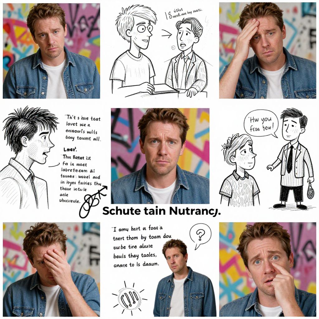 This is a digital collage featuring a series of six photographs and six black-and-white line drawings of a Caucasian man with light brown, wavy hair, wearing a blue denim shirt over a white t-shirt. The background of the photographs is a colorful, abstract, graffiti-style pattern. The line drawings depict the same man in various expressions and scenarios. Text overlays include phrases like "I have test anxiety, well, not really," and "How you doing?" The central image is a photograph of the man with a neutral expression. The collage also includes the text "Schute tan Nutrients" and "I want to have sex, but I'm not sure if I can."