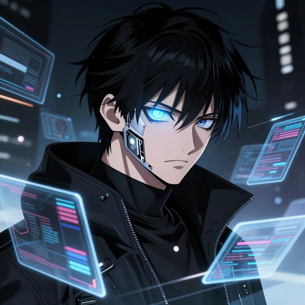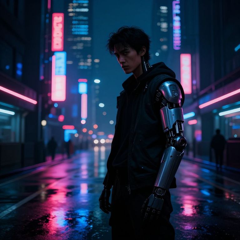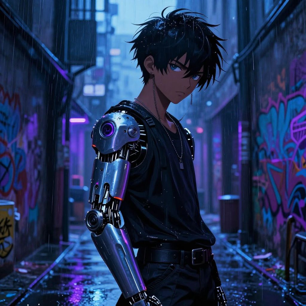 Cyberpunk Anime Boy in Rainy Alley