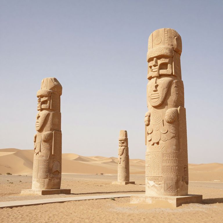 Photograph of three large, sand-colored stone monoliths with intricate carvings, standing in a desert landscape under a clear blue sky. The monoliths, resembling human faces with elongated features and headdresses, are positioned in a triangular formation. The sand dunes in the background add a sense of scale and isolation. The foreground shows a sandy, textured ground, and each monolith is mounted on a rectangular stone base. The carvings include geometric patterns and symbolic designs. The lighting is bright and even, highlighting the textures and details of the stone.