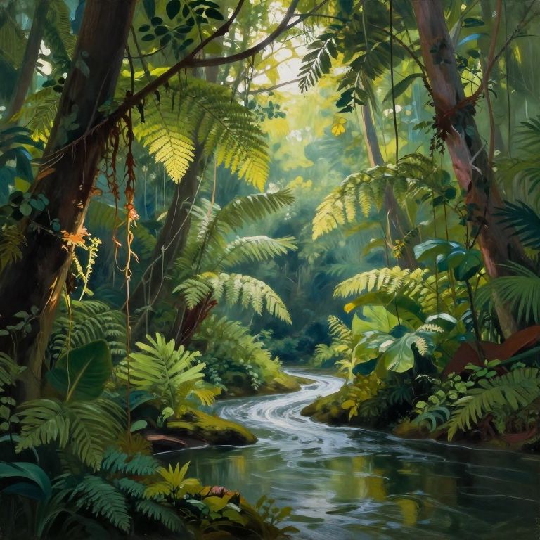 Digital painting of a lush, sunlit rainforest with a winding stream, dense ferns, and tall trees, creating a serene, vibrant jungle scene