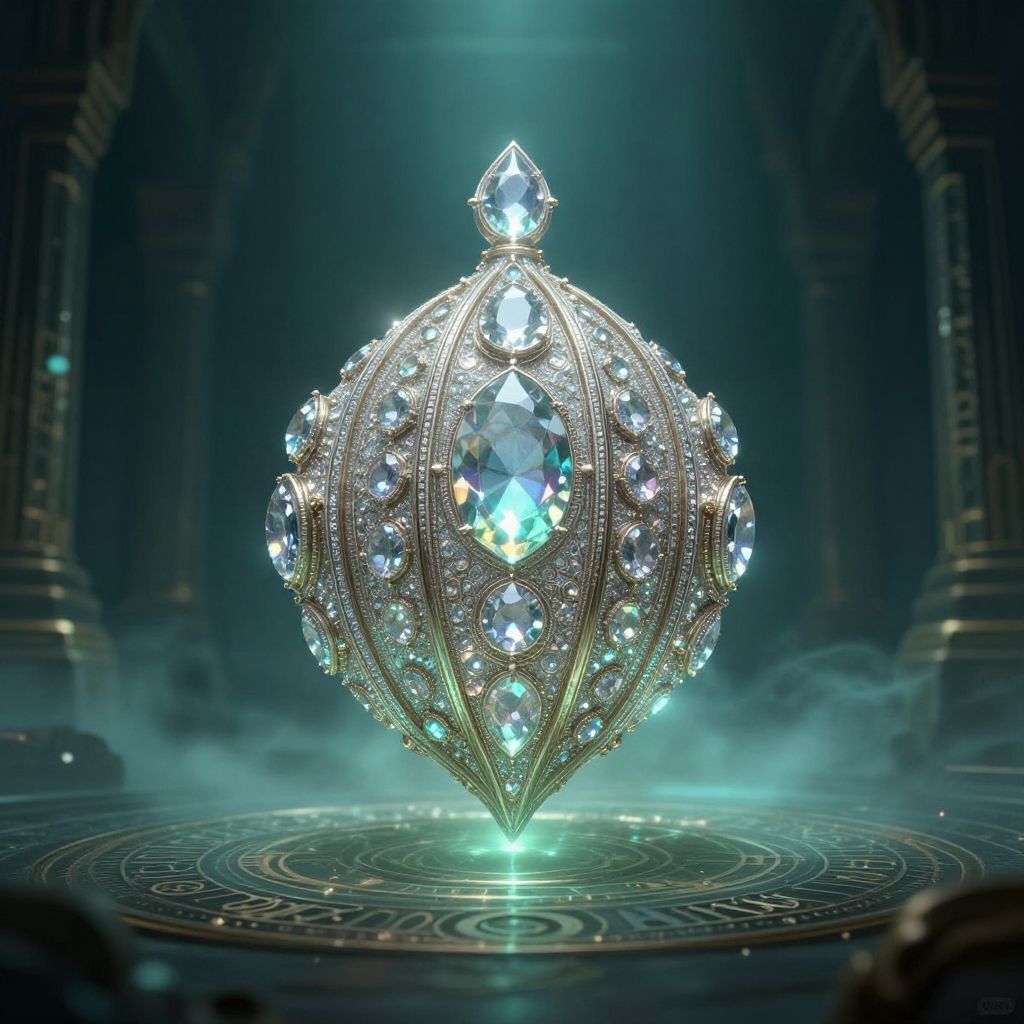 Photorealistic CGI image of an ornate, gem-encrusted, teardrop-shaped artifact illuminated by ethereal blue light. The artifact is centered on a glowing, circular, metallic platform with intricate patterns. It is surrounded by mist, and the background features dark, towering pillars, creating a mysterious, otherworldly atmosphere. The artifact is adorned with large, faceted blue and white gems, and its detailed, metallic surface reflects light, adding a sense of depth and elegance. The overall color palette includes dark blues and blacks with bright, shimmering highlights from the gems.
