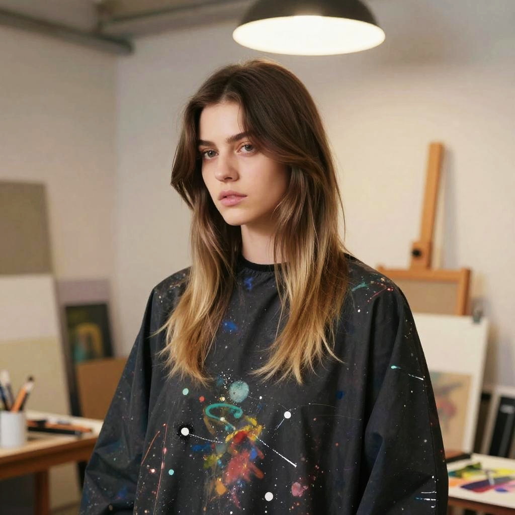 Ombre hairstyle on young woman, wearing vintage floral dress, in countryside field, captured in fashion editorial style with golden hour sunlight.