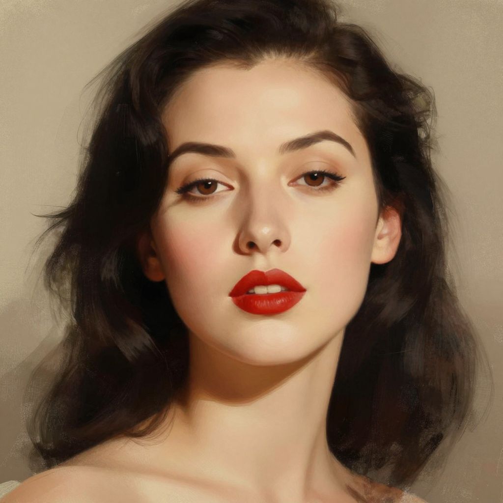 A Modigliani-inspired digital painting featuring a portrait of a woman with dark hair, bold red lips, and a serene expression, rendered in a vintage, high-definition style with soft, warm tones and a textured background.