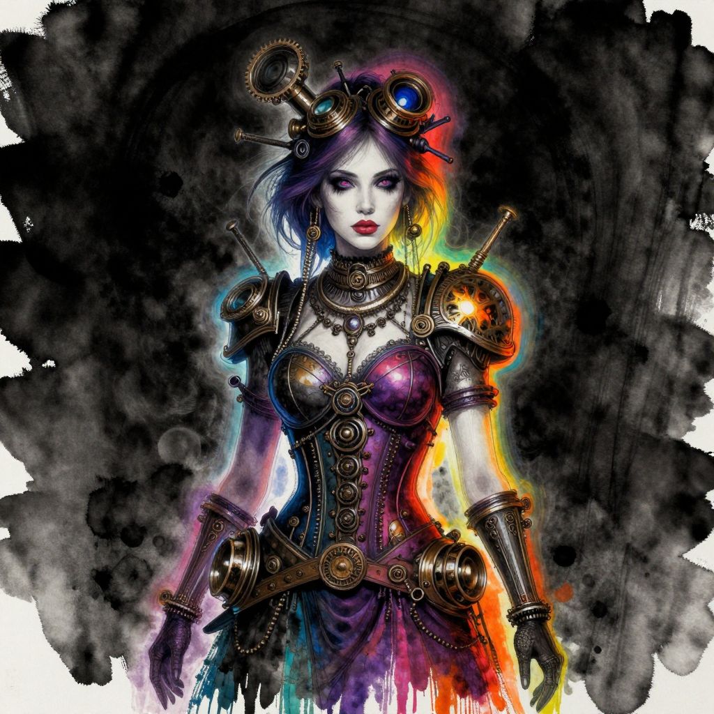 An intricate ink wash painting of a beautiful woman with vibrant color drips and splashes, featuring steampunk elements, a rainbow ratio, a glowing, ominous, haunting atmosphere, and studio lighting with rim lighting against a vantablack abstract background.