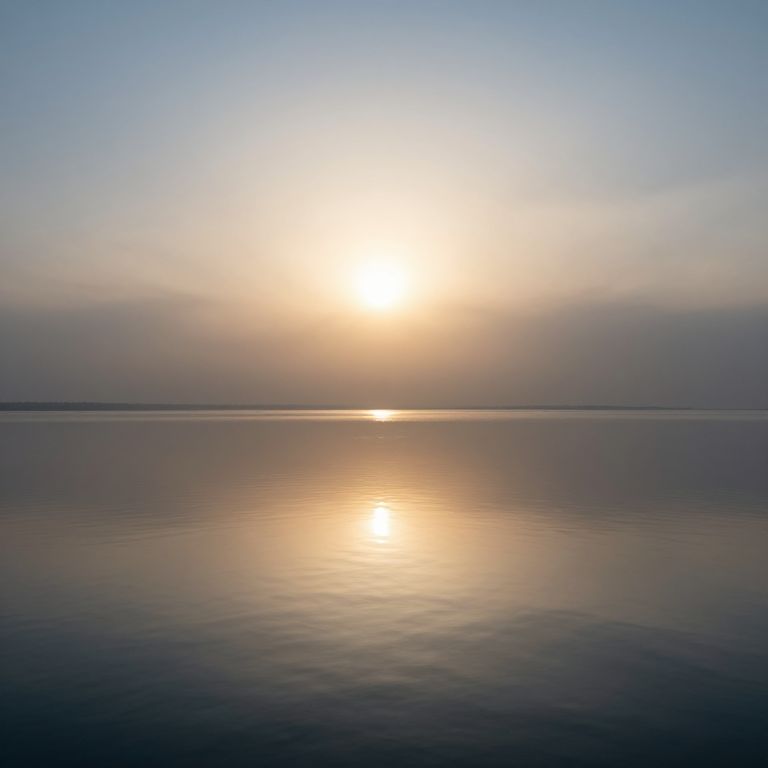 Photograph of a serene sunset over a calm, reflective body of water. The bright, glowing sun is centered in the upper part of the image, casting a warm, yellow-orange reflection on the water's surface. The sky transitions from a clear blue at the top to a soft, hazy pink near the horizon. The water below is smooth, mirroring the sun's light, with subtle ripples creating a gentle texture. There are no objects or people in the image, emphasizing the peaceful, natural beauty of the scene. The overall color palette includes shades of blue, pink, yellow, and orange.