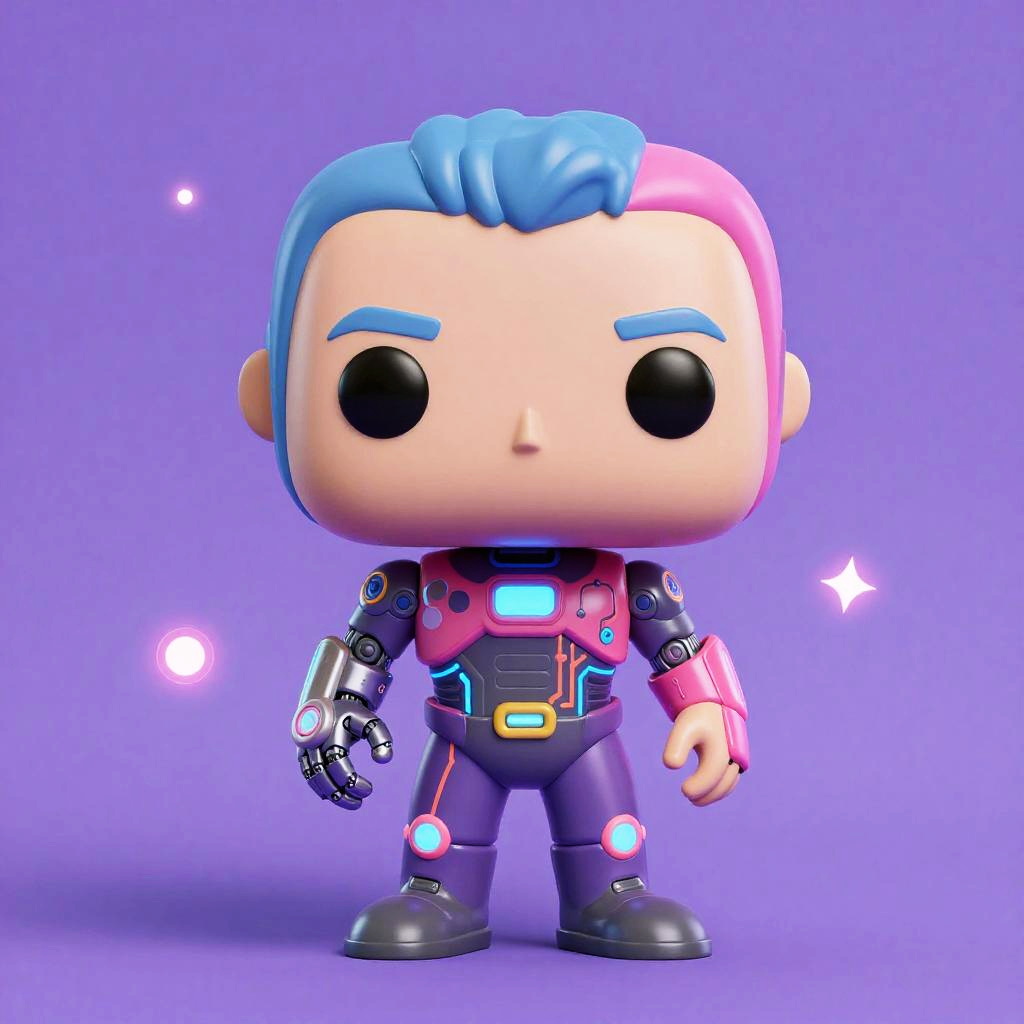 Funko AI figure in futuristic cybernetic style, vibrant neon colors, glossy plastic texture, detailed robotic eyes and circuits, dynamic pose with glowing elements, studio lighting, digital art