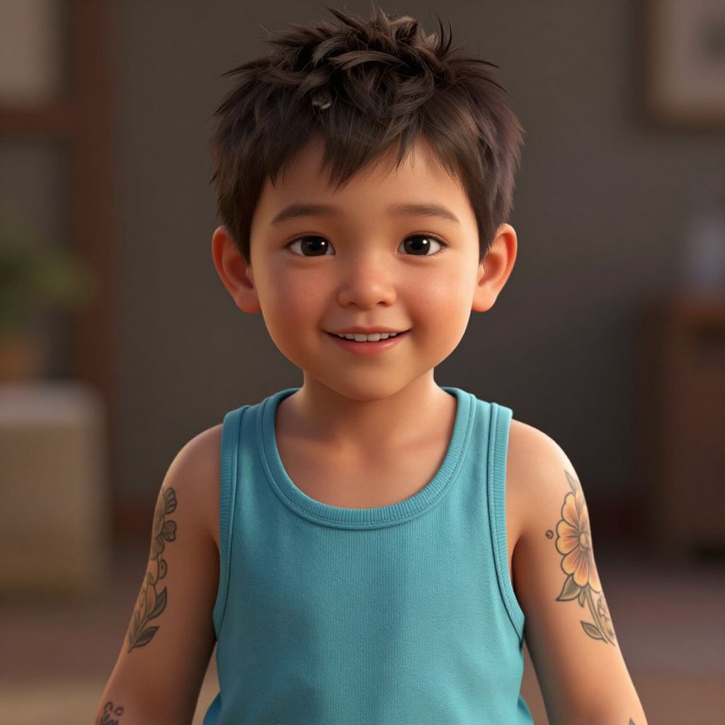 Photorealistic CGI of a smiling young boy with short black hair, wearing a blue tank top, showcasing floral tattoos on his arms, against a blurred
