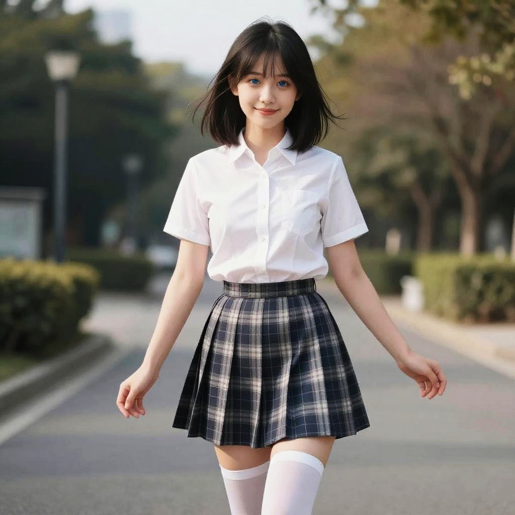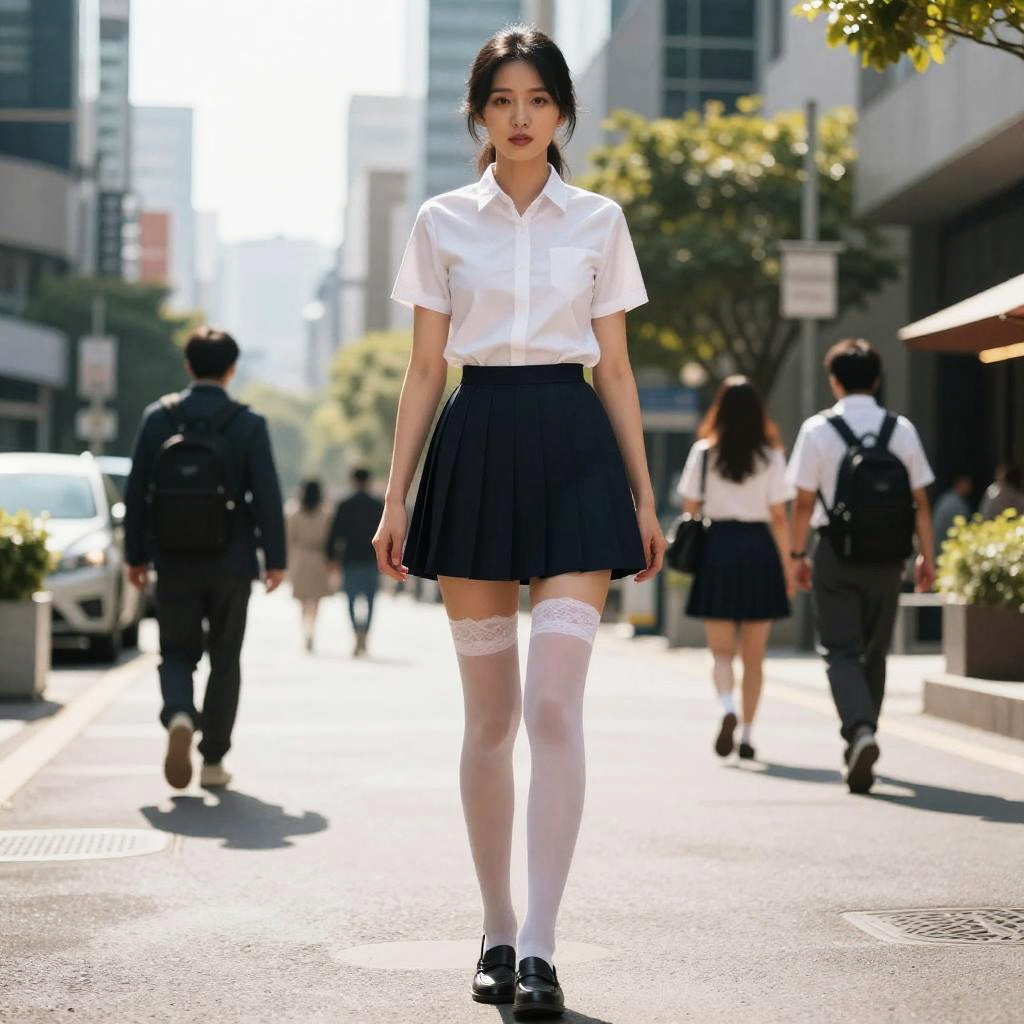 1girl, ((best quality )), (masterpiece), (realistic shadow), ( depth of field), (sunny city background ), (highlight face detail), (nude:0.5), unparalleled masterpiece, ultra realistic 8k, perfect artwork, ((perfect female figure)), mature female, milf, narrow waist, small breasts, black hair, hair pulled back, detailed skin, looking at viewer, perfect face, perfect body, photorealistic, masterpiece, 8k, high res, lens flare, (jk:1.3), (school uniform:1.3), (high school uniform:1.4), JK, full body, skinny, thin legs, lace white pantyhose, white thighhighs