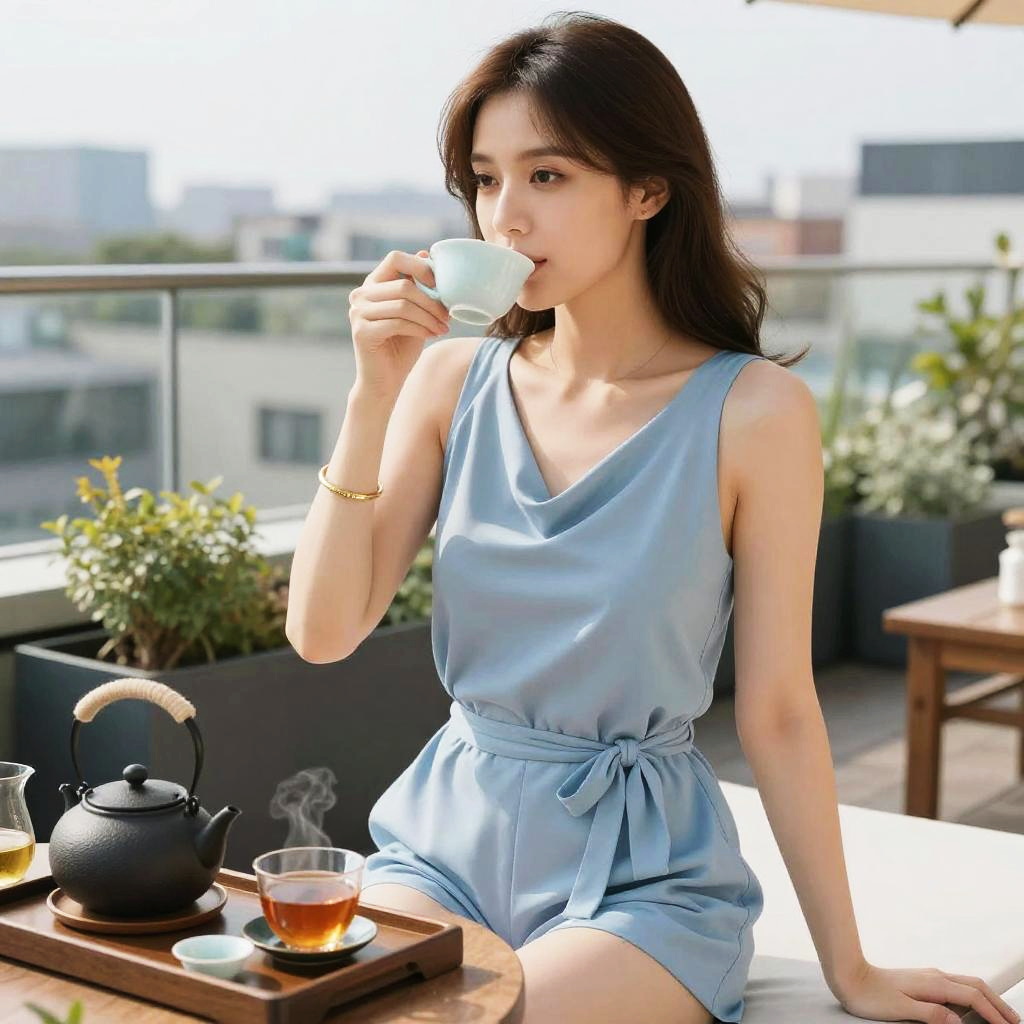 A petite woman in a contemporary chic black strapless dress with a sheer neckline and high front slit, strappy black heels, enjoying a tea service in a sunlit conservatory, captured in a vibrant, elegant visual style. Sexy. Pretty face and beutiful eyes