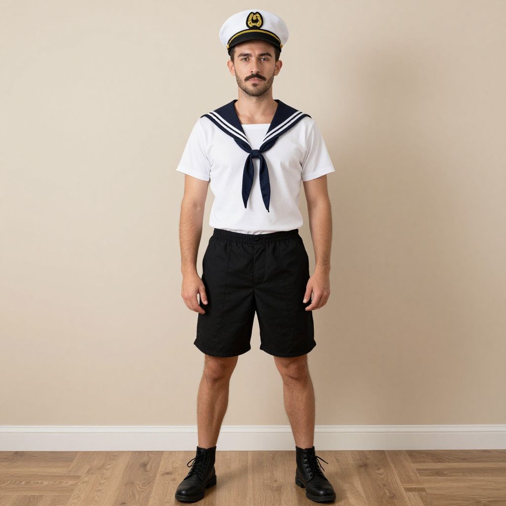 Photograph of a young man standing against a plain beige wall with light wooden flooring. He has a medium build, light brown skin, dark hair, and a mustache. He is wearing a white sailor-style shirt with a black neckerchief, black shorts, black shoes, and a white sailor hat with a black emblem. His arms are relaxed by his sides, and he gazes directly at the camera with a neutral expression. The background is simple and uncluttered, drawing focus to his nautical-themed outfit. The lighting is even, with no visible shadows.