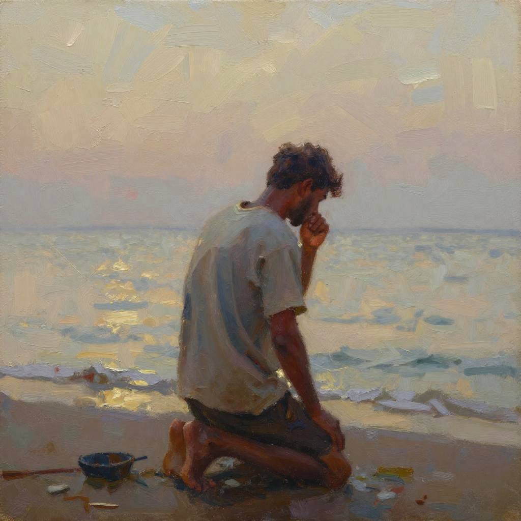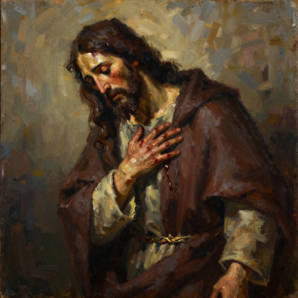 An oil painting of a pair of monks offering incense in a smoky chapel, styled with vivid but restrained brushwork with warm sepia tones. Warm lighting, rough edges, neutral backdrop, religious and emotional composition