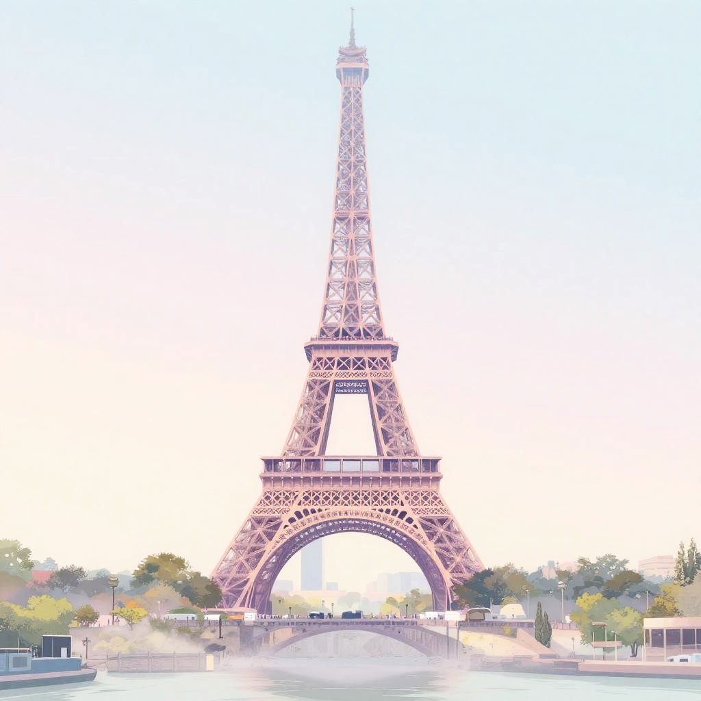 Eiffel Tower trace rendered in bright pastel colors, minimalist line art style, floating over a misty Paris river scene, soft lighting and gentle gradients, whimsical feel