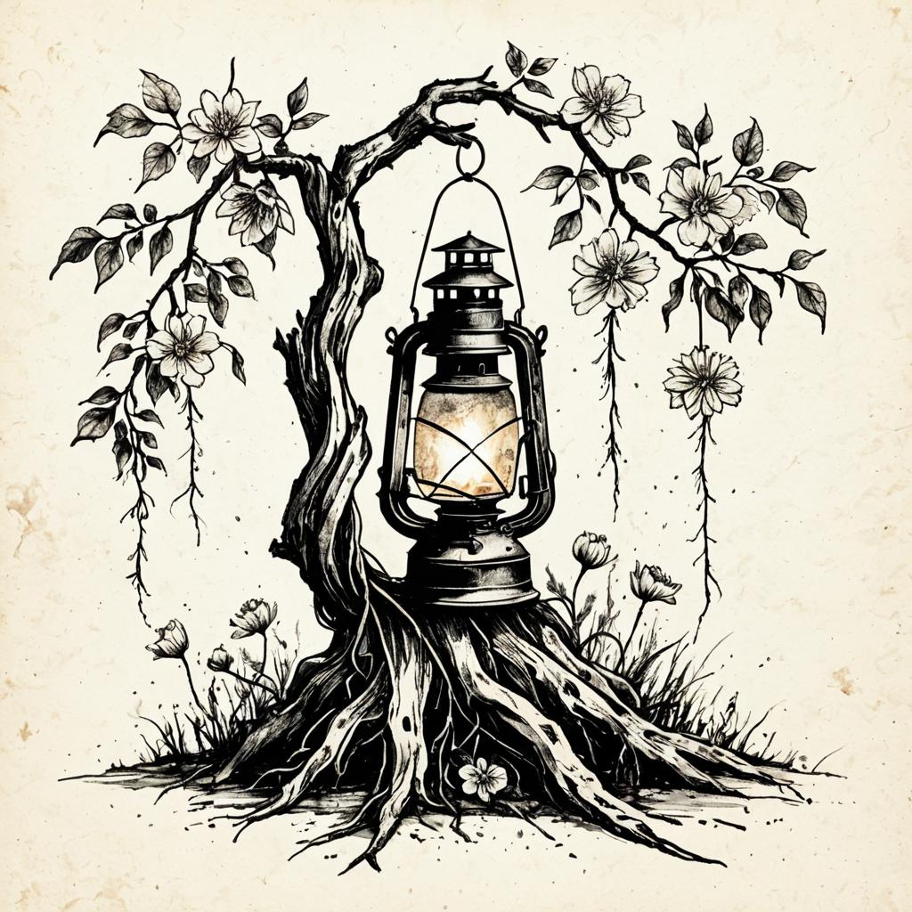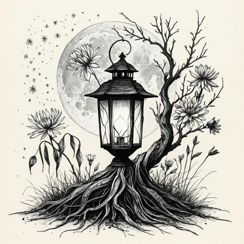 Ethereal jellyfish, growing long roots and flowers, luminescent glowing ink, textured paper, slight water stains, white background