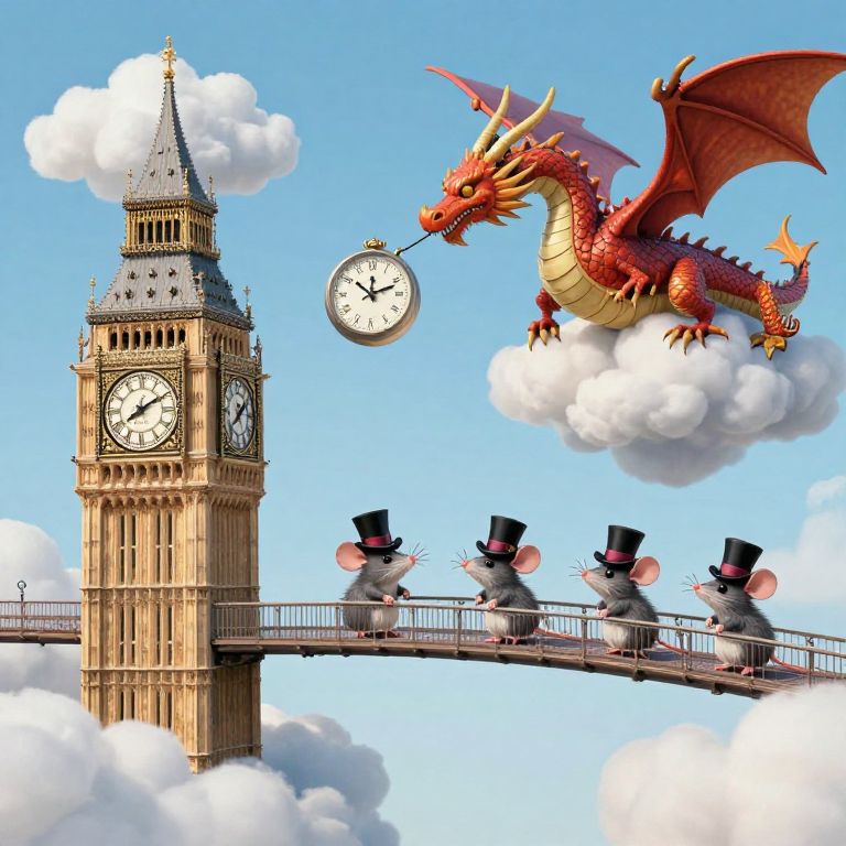 Whimsical digital illustration: Red dragon on cloud above Big Ben clock tower, clock floating, four mice in top hats crossing bridge.