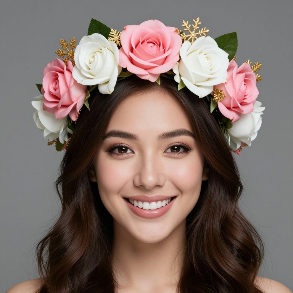 Smiling woman wearing a vibrant floral crown featuring six roses—three pink and three white—adorned with gold snowflake accents and green leaves, set against a neutral gray background.
