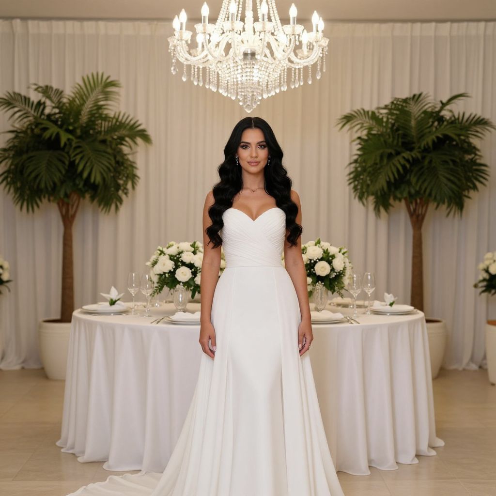 Photograph of a beautiful woman with long, wavy black hair standing in front of a white wedding dress with a strapless bodice and a flowing skirt. She's centered in front of a round, white-draped table with floral arrangements and wine glasses. The background features tall, green potted plants and a large, sparkling chandelier hanging from the ceiling. The room has a warm, elegant ambiance with cream-colored curtains.