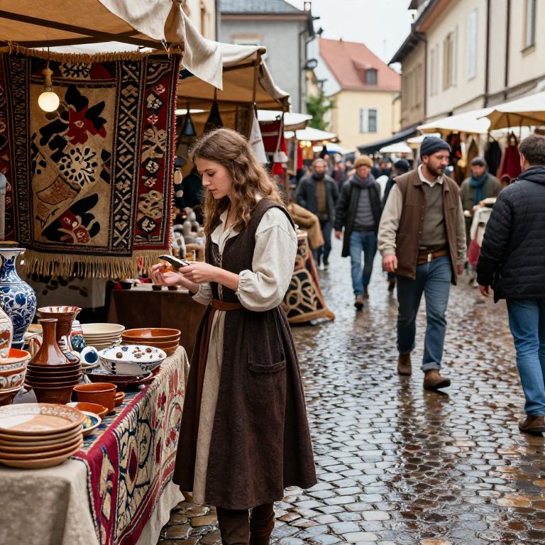 Photograph of a cobblestone street market. A young woman with wavy brown hair, wearing a white blouse and brown dress, stands at a stall examining pottery. The stall, covered with a colorful patterned cloth, displays various ceramic bowls and vases. Background shows other marketgoers in winter clothing, including a man in a brown vest and blue jeans. The street is wet, reflecting the market's canopy lights. Buildings with red-tiled roofs line the street, adding to the European market atmosphere. The image has a vivid, slightly saturated color style.