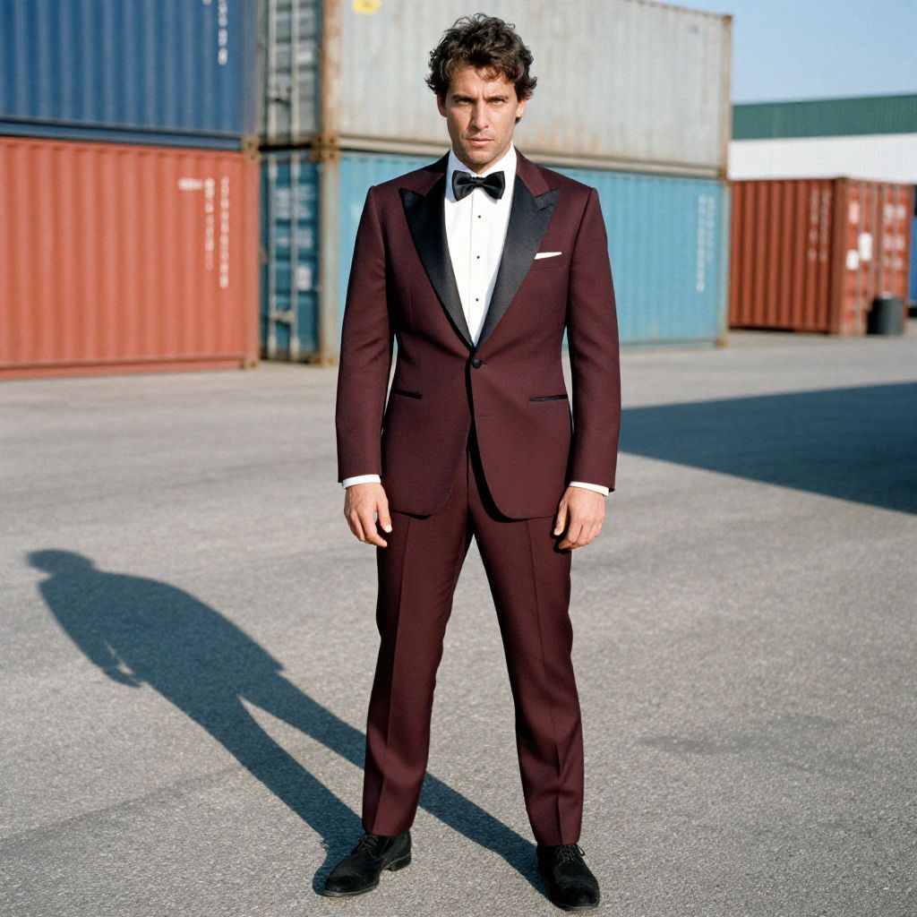 A man, burgundy tuxedo, satin lapels, white dress shirt, black silk bow tie, black suede derby shoes, sunlit docks, AgfaColor film, confident expression, vibrant shipping containers in the background. Man has masculine face and piercing eyes
