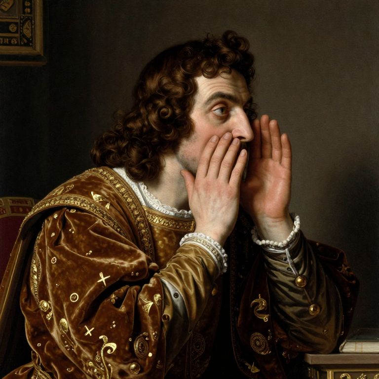Photorealistic digital painting of a curly-haired, medieval man with fair skin, wearing an ornate brown velvet robe, covering his mouth in surprise or