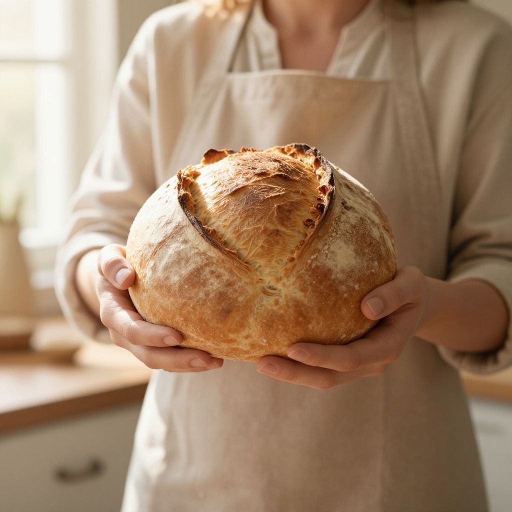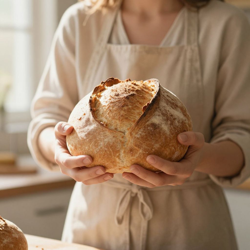 Photograph of a person in a beige apron holding a golden, crusty loaf of bread in a sunlit kitchen.