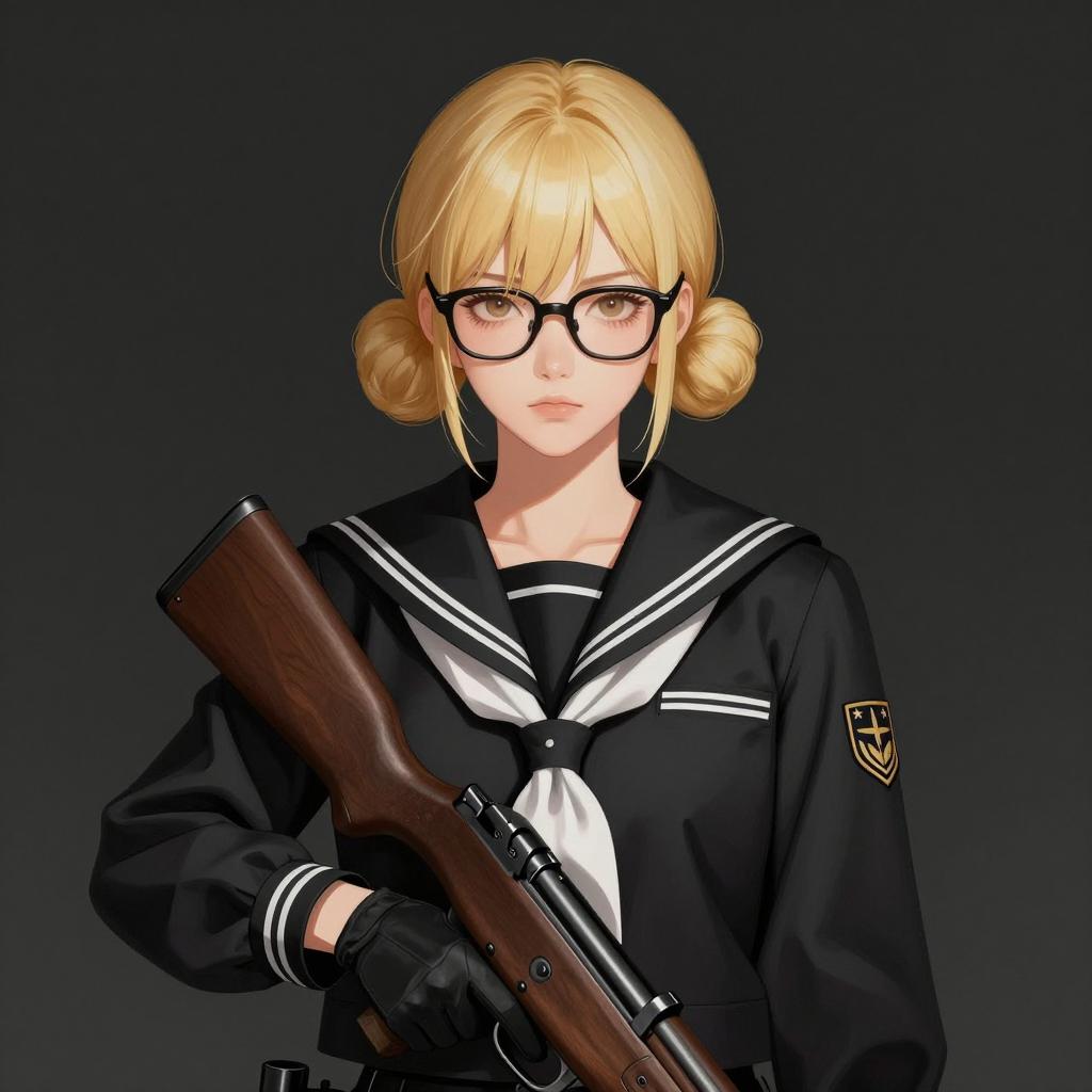Digital illustration of a woman's lower body wearing a short brown pleated skirt with white trim, black sheer thigh-high stockings, and black Mary Jane shoes. She is standing with one leg crossed over the other while holding a large, detailed metallic gun with black grip and various mechanical parts. The background is plain gray, emphasizing the contrast between the clothing and the firearm.